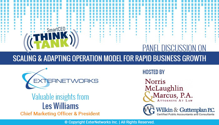 ExterNetworks was awarded the prestigious ‘2016 NEW JERSEY FUTURE 50 SmartCEO Award,’ on February 18, 2016. SmartCEO and Norris McLaughlin & Marcus, P.A. gathered a cross-section of the 2016 New Jersey Future 50 winners for a ‘Think Tank Discussion’ on ‘Adapting your operation model for future growth’ where the panelists were asked about how their organization scales its operations for growth. The panelists discussed various strategies that their organization employs to keep up with fast-pace growth. Les Williams, ExterNetworks’ Chief Marketing Officer & President, was one of the panelists in the discussion who shared strategies that ExterNetworks uses to outpace a growing competitive landscape. Here is a summation of the excerpt from the conversation that Les had with Bob Gabrielski, the moderator of the discussion.
